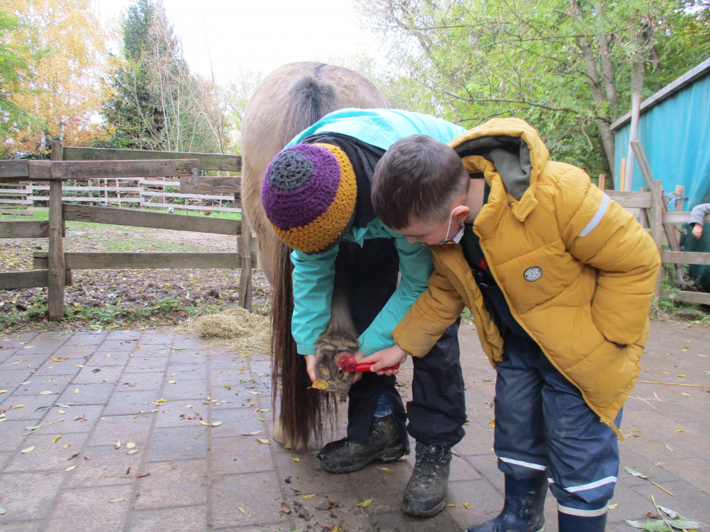 Die Eulenklasse und die Eichhörnchenklasse waren im Herbst auf dem Abenteuerhof. Das war toll! Wir haben auf dem Pferdehof mitgeschafft. Wir haben den Stall ausgemistet, den Pferden Wasser und Heu gebracht, die Pferde gestriegelt und gebürstet und die Hufen ausgekratzt. Das Reiten war super! Wir freuen uns schon auf das nächste Projekt im Frühjahr.